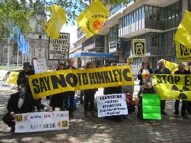 Stop Hinkley Protesters Over 20 people including Stop Hinkley members lobbied shareholders at last Friday's (11 May2012) AGM of energy company Centrica in London asking them not to invest in Hinkley C. Carrying a banner reading "Don't Invest in Risky Nuclear Power" they handed out leaflets warning of the financial dangers involved. The Financial Times had already reported that Centrica was threatening to pull out of the deal in which it would take up to a 20% stake in Hinkley C, mainly due to uncertainty over government financial support. Stop Hinkley member and Centrica shareholder, Sue Aubrey, was able to ask a question during the meeting asking for an assurance from the board of directors that they "are not going to get involved in this dangerous and risky proposal."