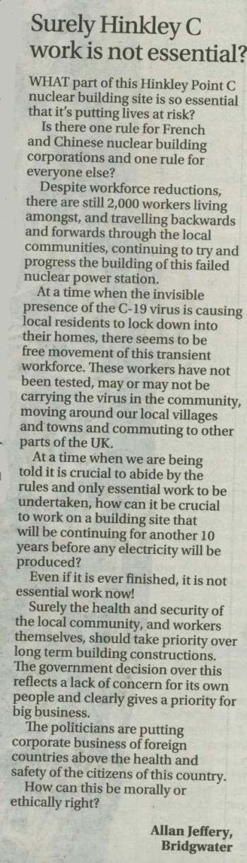 Surely Hinkley C work is not essential? 17th March 2020 What part of this Hinkley Point C nuclear building site is so essential that it’s putting lives at risk?